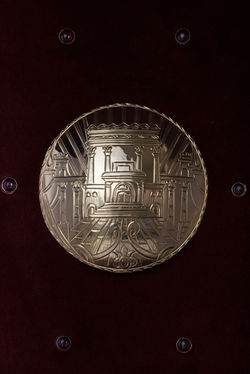 Torah ark with white onyx pillars and the tablets of stone on top.