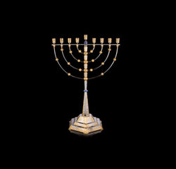 One of a kind sterling silver Menorah with gold accents, embellished with blue Lapis marble.